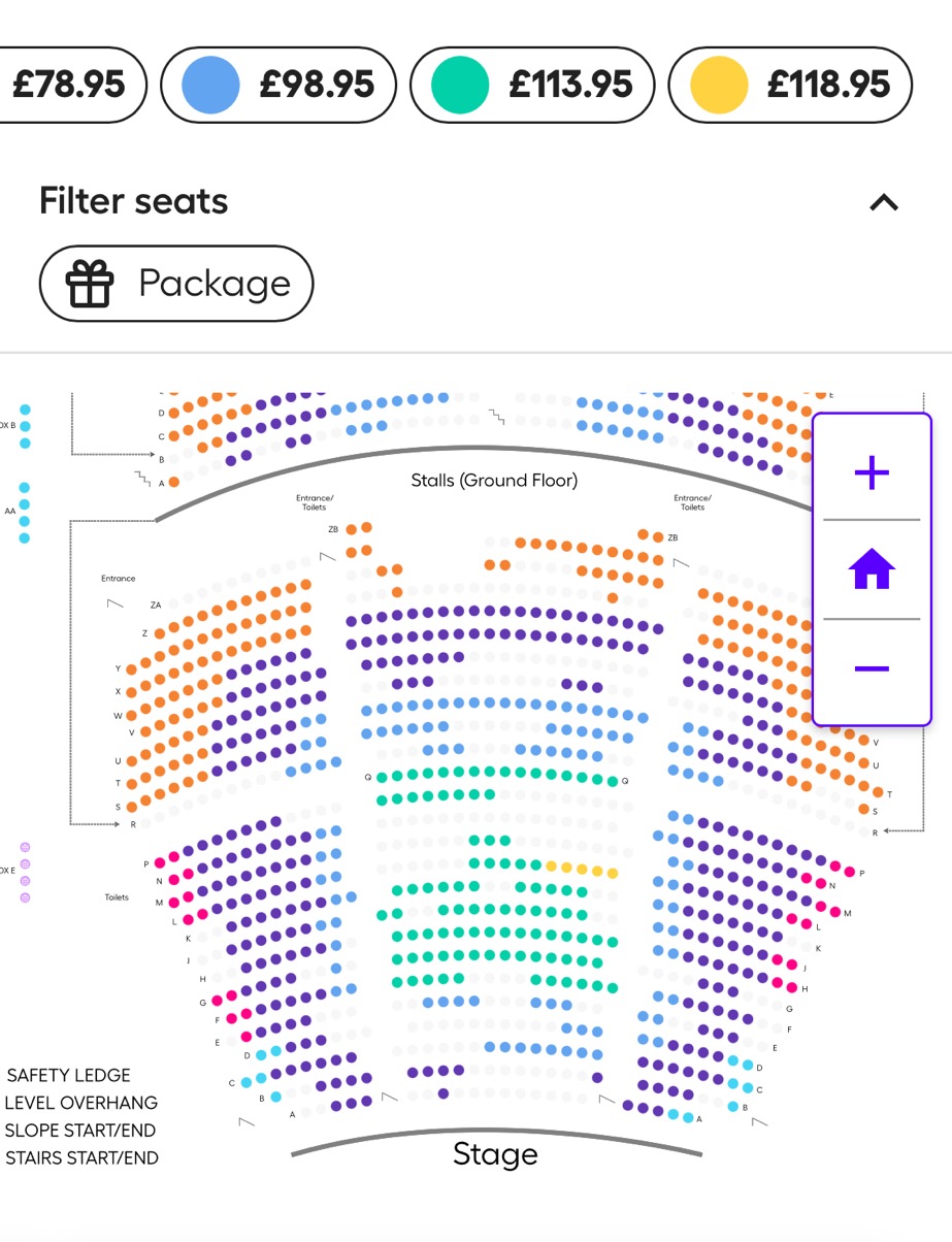 ATG 사이트에서 라이언킹 공연을 볼 날짜와 시간을 골라 들어가보면 좌석별 가격대가 다양하다. 34파운드가 가장 저렴하고, 가장 비싼 좌석은 118.95파운드이다. 나는 세번째로 저렴한 핫핑크색 48.95파운드짜리 좌석을 골랐다. 1층 시야제한석인데, 왼쪽 오른쪽 어디할까 고민하다가 바로 옆에 화장실이 있는 쪽을 선택했다.